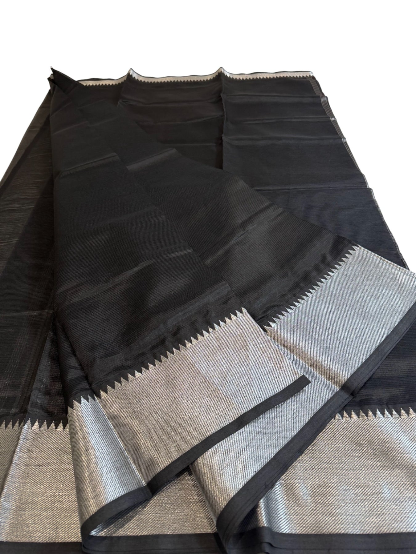 Experience the grace of traditional South Indian weaving with this Black Mangalagiri Saree, crafted with refined elegance and timeless aesthetics. The saree features a rich deep-black body enhanced with beautifully woven silver zari stripes and geometric motifs, giving it a sophisticated and modern appeal.