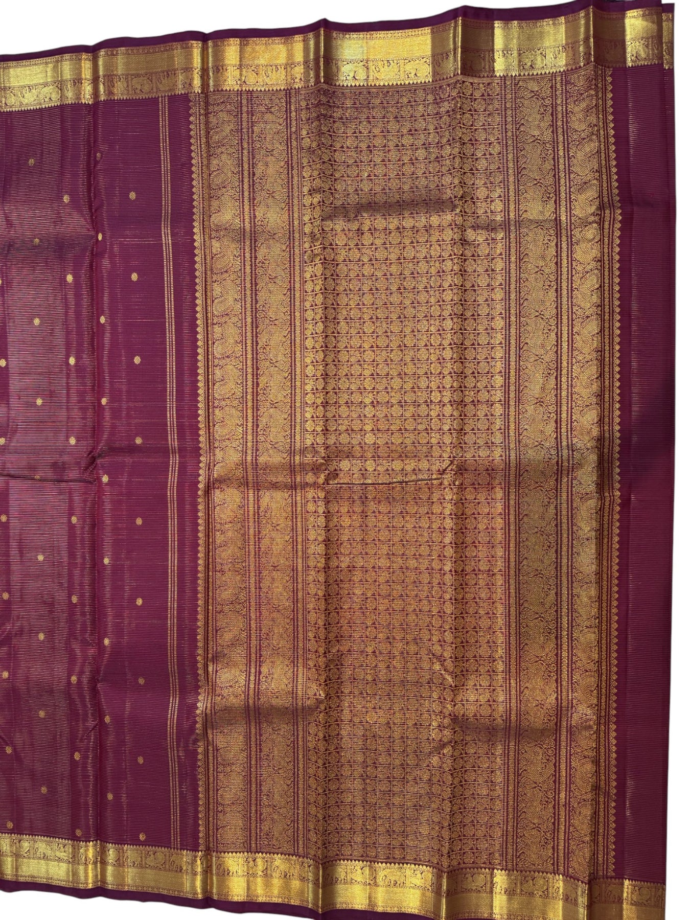 Border: Rich gold zari temple & peacock pattern border