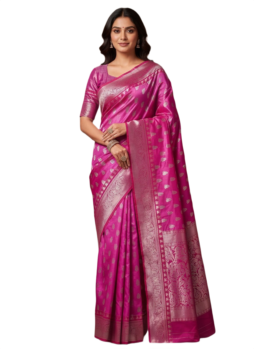 The saree features delicate silver buttas, complemented by a finely woven silver and pink zari border, giving it a truly royal finish.