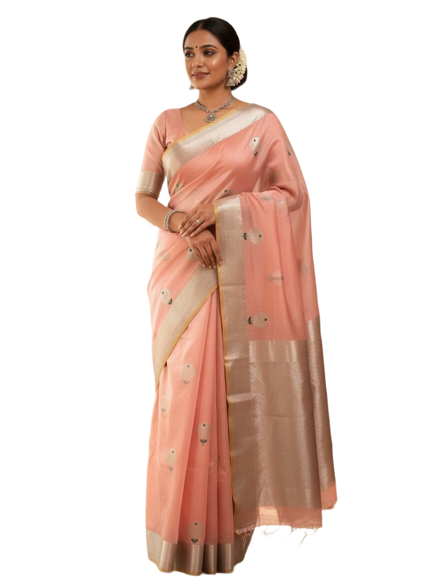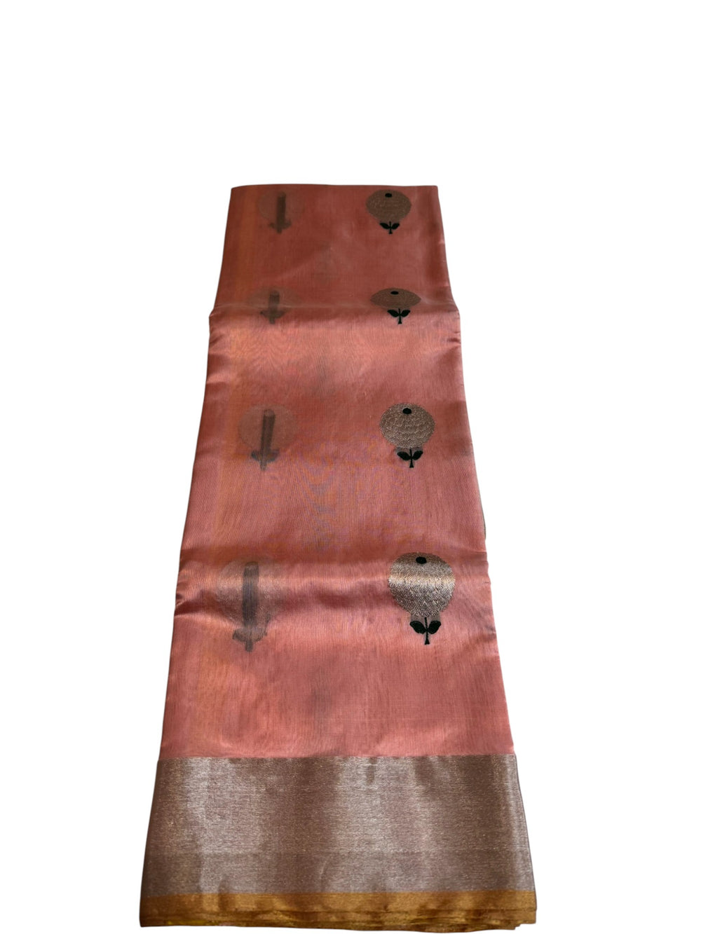 Elegant Chanderi Silk Saree – Peach with Antique Silver & Gold Border