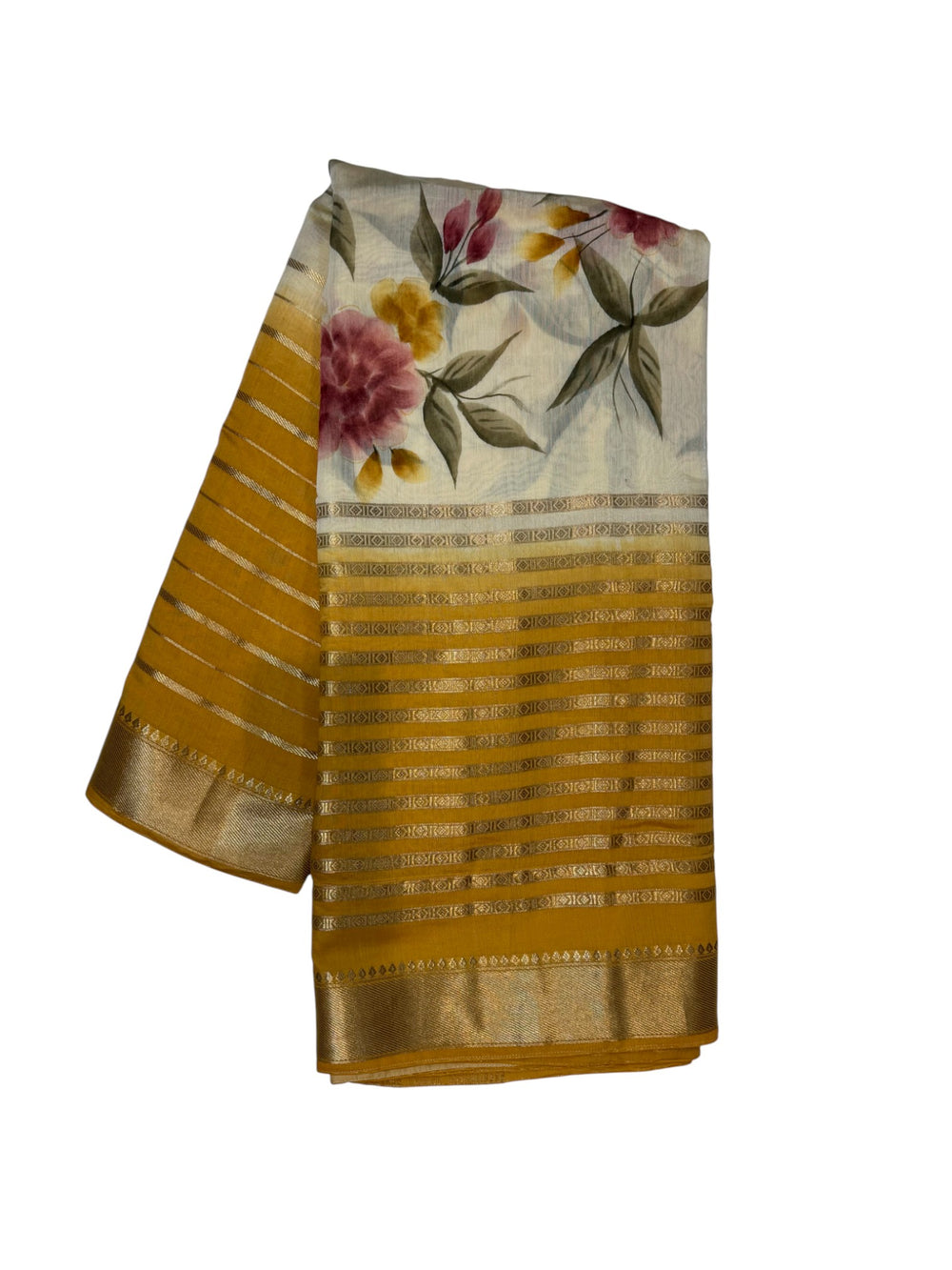 Designer Georgette Saree – Ivory Hand-Painted Floral Saree with Contrast Blouse