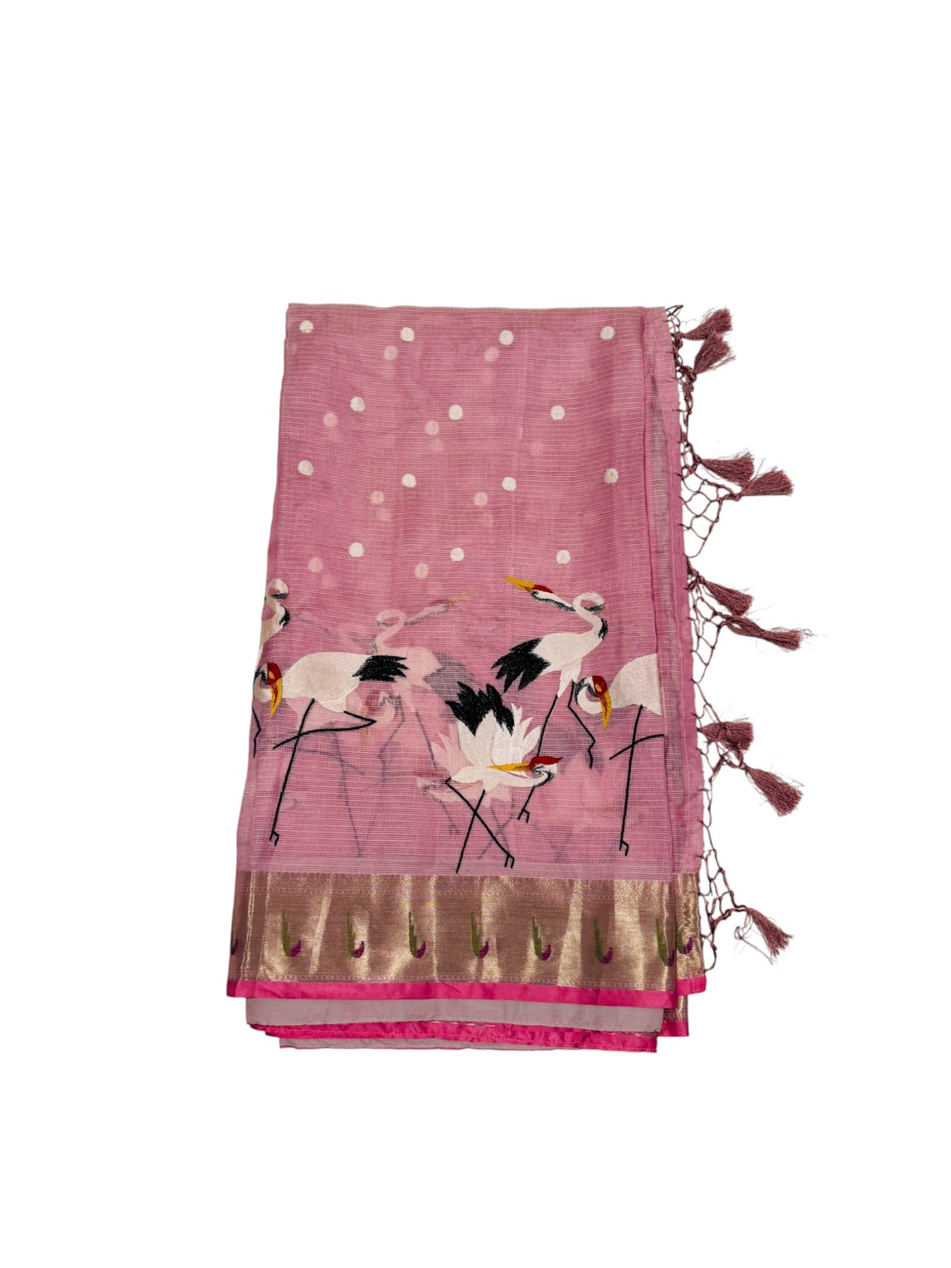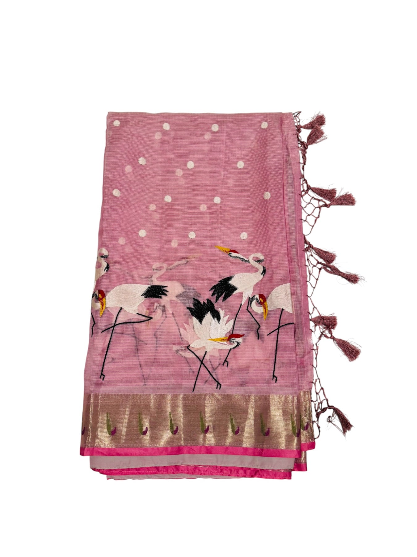 Design: Embroidered bird motifs, woven buttas, tassel edging