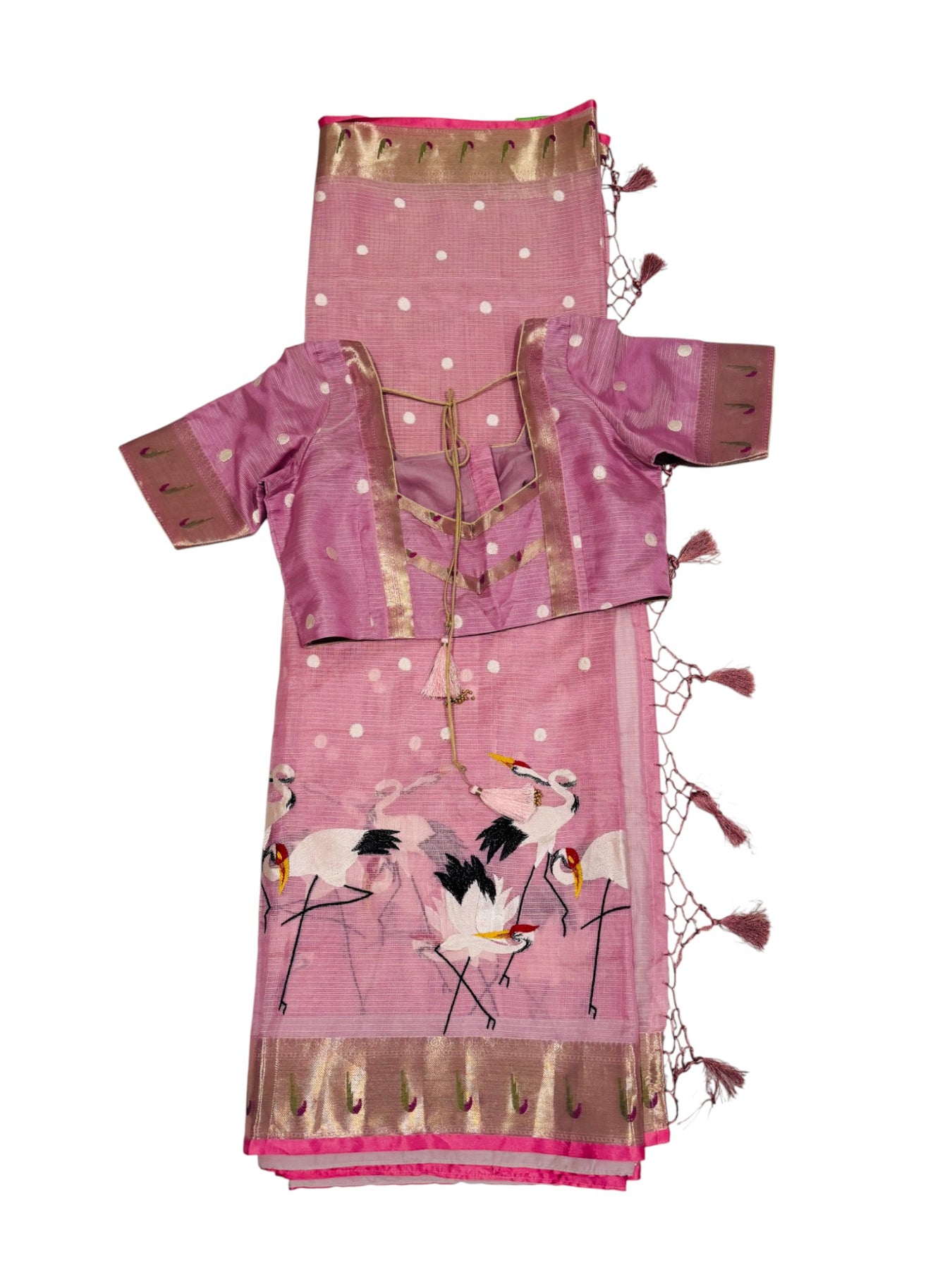 The saree comes with a matching pink stitched blouse, designed with subtle threadwork, stylish tassel ties, and a woven finish that complements the saree perfectly. This combination offers a comfortable yet sophisticated ethnic look suitable for both everyday elegance and special gatherings.