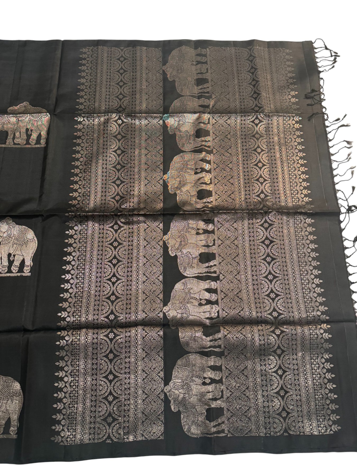 Design: Silver zari elephant motifs throughout the body