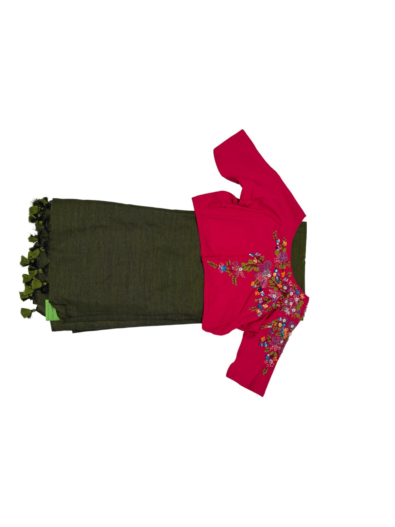 Olive Green Jute Saree with Pink Embroidered Stitched Blouse