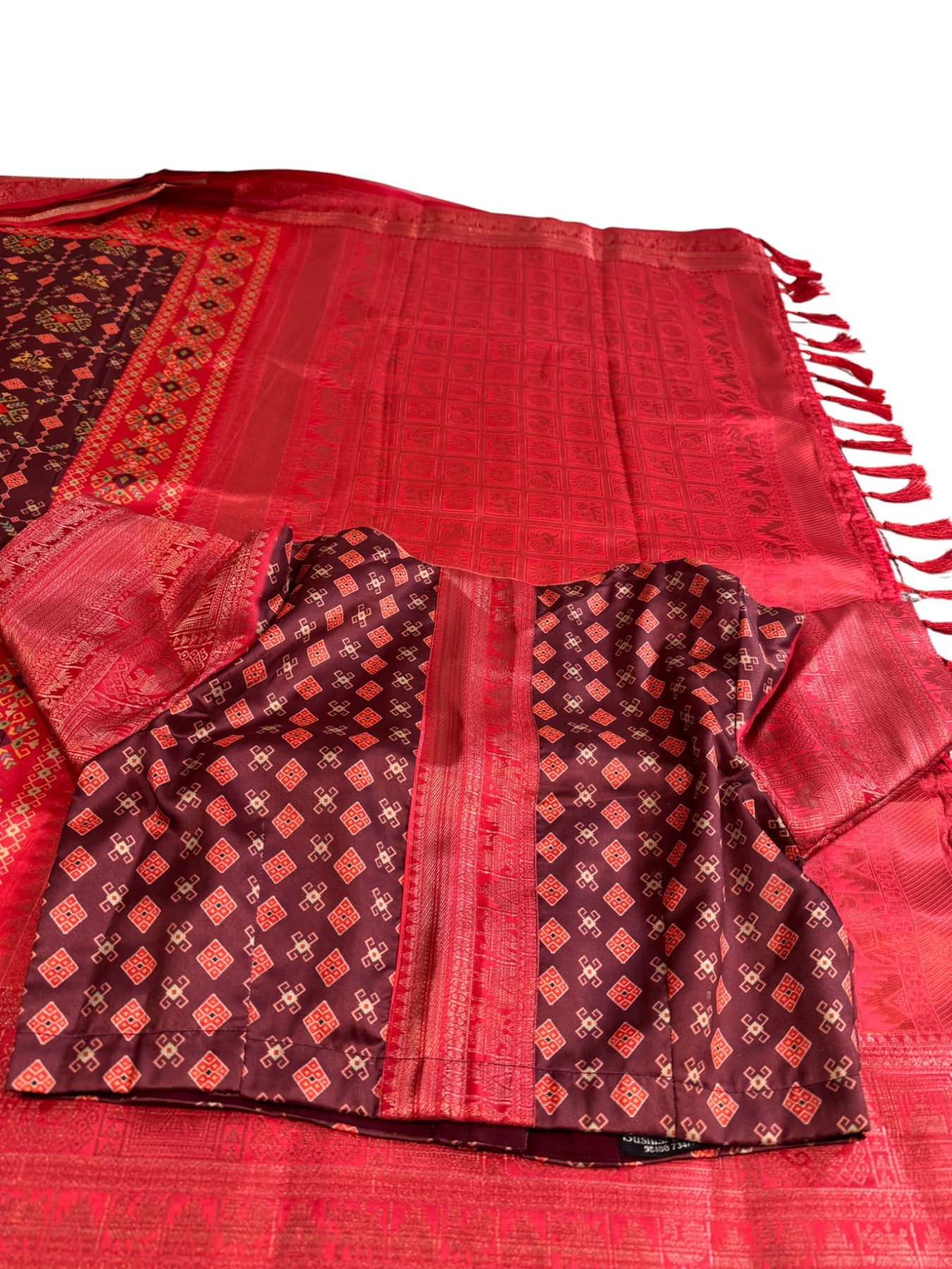 The contrast maroon blouse with geometric woven designs adds a stylish highlight, making this saree perfect for weddings, receptions, festive occasions, and evening events.