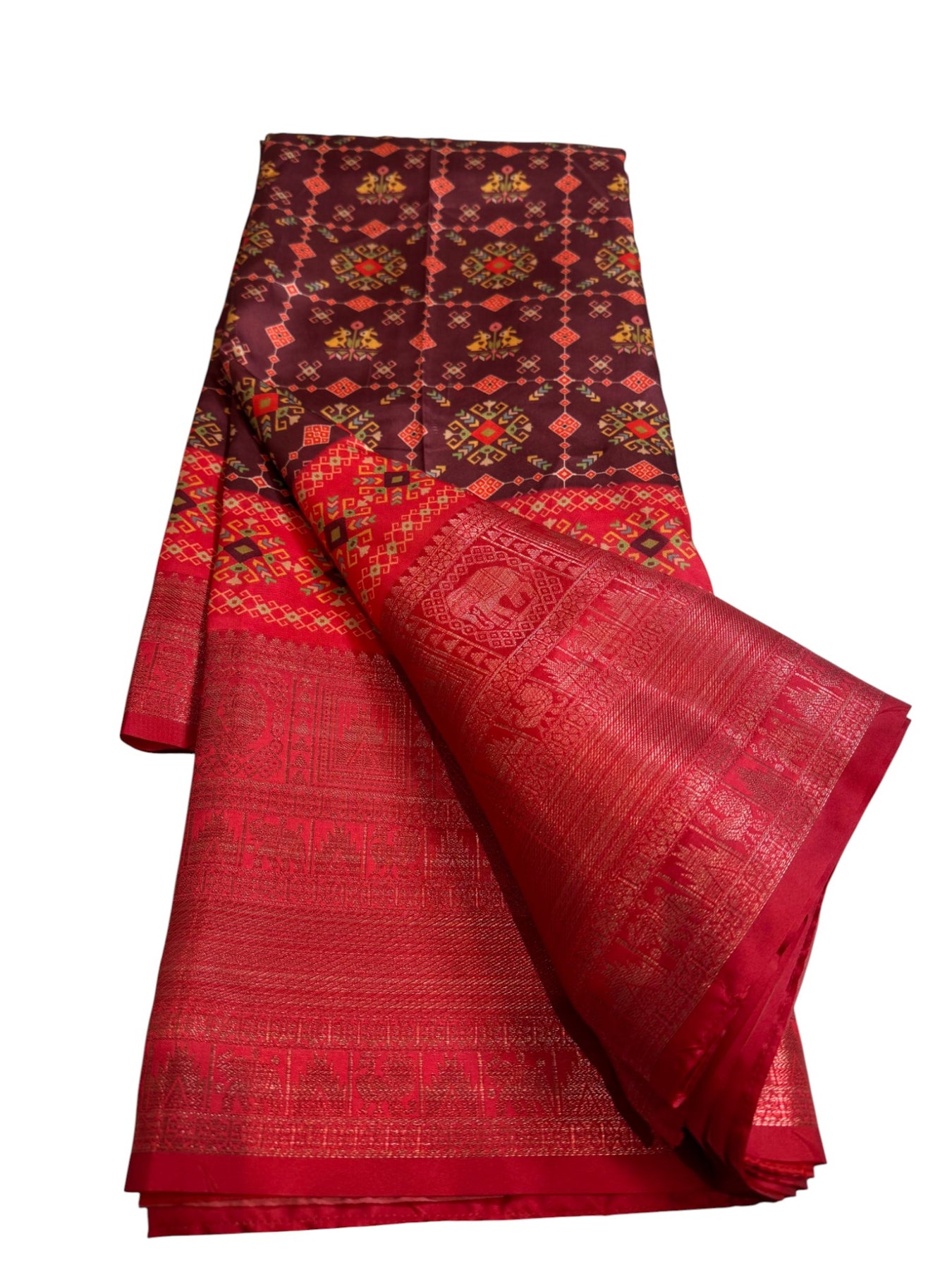 Designer English Crepe Saree in Red & Maroon Patterned Detailing