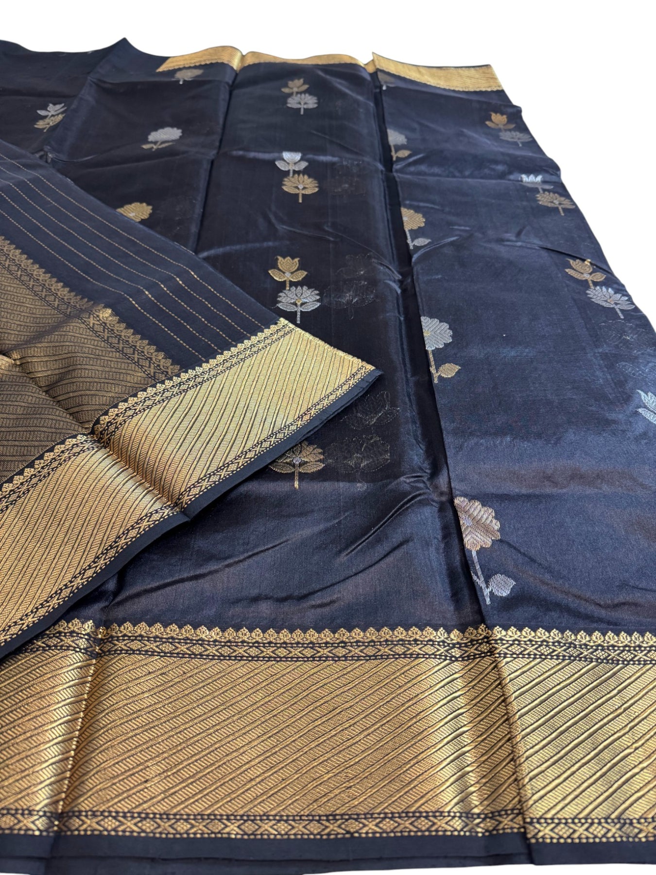 Pallu: Luxurious gold zari pallu for a grand finish