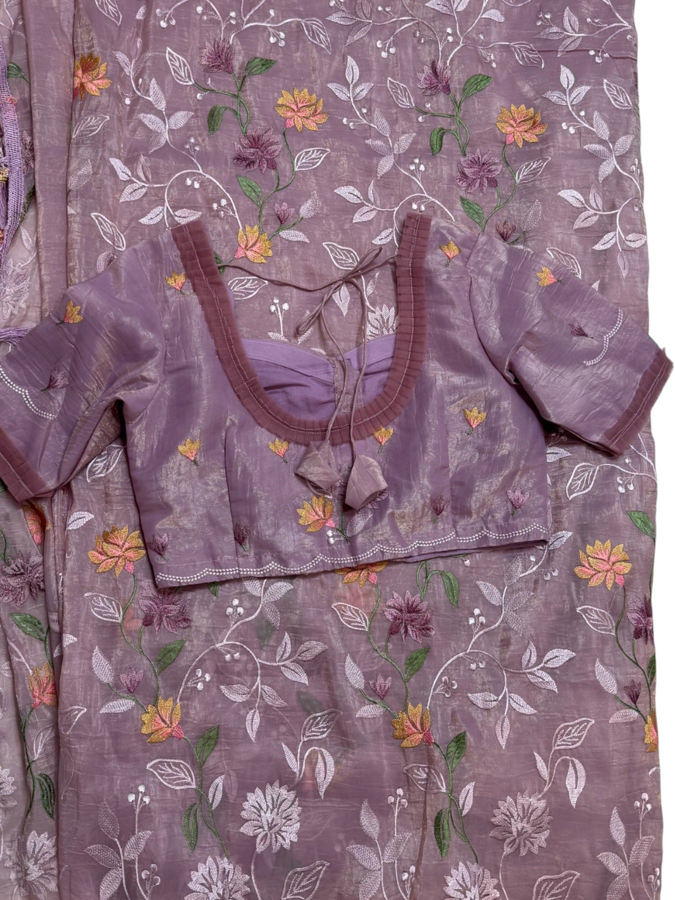 Space Silk Fancy Saree with All-Over Floral Embroidery & Stitched Blouse