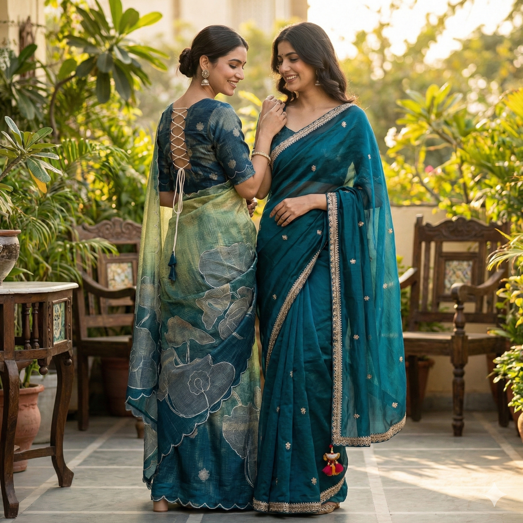 The saree comes paired with a designer stitched blouse in a striking red shade. Beautifully adorned with gold thread embroidery, zari detailing, and handcrafted embellishments on the neckline and sleeves, the blouse adds a luxurious touch to the entire ensemble.